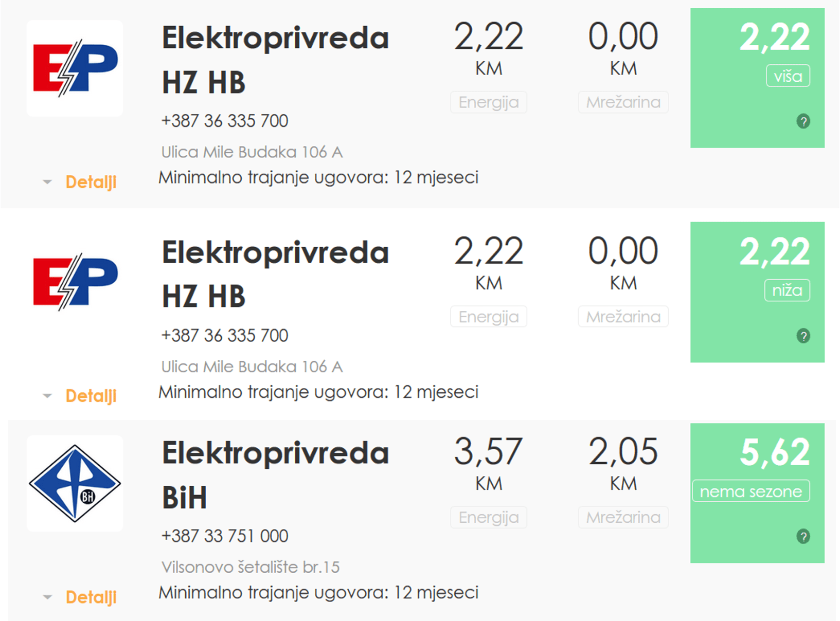 Energiju na naponskim nivoima 35 kv. * cene tarif veljajo od 1. * zahtjev za žurnom uspostavom električne energije može podnijeti kupac radnim danom od 10:00 do 14:15 sati, a podrazumijeva uspostavu isporuke električne energije isti dan. ** trošak slanja opomene odnosi se isključivo na kupce kategorije poduzetništvo Kada je hera donijela metodologiju za određivanje iznosa tarifnih stavki za opskrbu električnom energijom. Jeftiniju struju od nas u eu plaćaju jedino rumunji, litavci, mađari i … Ukupna cijena za električnu energiju koju plaćaju kupci treba da pokriva sljedeće troškove: Redni cenik električne energije za gospodinjske odjemalce. Tarifni stavovi za rezervno snabdijevanje... Trošak nabavke električne energije, trošak mrežarine, te naknada za obnovljive izvore energije koja se naplaćuje od svih krajnjih kupaca električne energije u fbih.